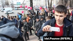 Оппозиционеры, без сомнения, усвоили урок, полученный 28 января, когда еще до начала акции полиция задержала весь состав регионального штаба и еще добрых два десятка активистов. В этот раз организаторы и основная масса участников подошли к месту сбора около Госцирка ровно к двум часам дня, и шествие началось без всякого промедления. Власти, впрочем, очевидно, также усвоили январские уроки, когда Уфа оказалась на первом месте в стране по количеству задержанных на "забастовке избирателей". Во всяком случае, полиция в этот раз не перегораживала маршрут шествия и никого не задерживала, ограничившись постоянным озвучиванием предупреждений о "несогласованности" публичного мероприятия, массированной видеосъемкой присутствовавших и сопровождением демонстрации по всему маршруту.