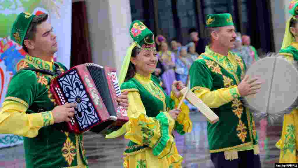 30 августа на площади перед театром Г.Камала прошел традиционный праздник "Играй, гармонь!". Шел дождь - зрителям, пришедшим к 10 утра, пришлось дожидаться начала музыкального праздника целый час. В прошлом году народу было ощутимо больше. В этот раз у театра Г.Камала не было ни одной вывески, ни одного баннера с поздравлениями с Днем Республики.