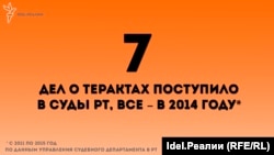 "Idel.Реалии" изучили статистику Управления судебного департамента в Татарстане и выяснили, что за последние пять лет в республике в пять раз выросло количество поступивших в суд дел по экстремизму, 93% из которых закончились обвинительными приговорами. Отметим, что уголовные дела за совершение терактов поступили в суды лишь в 2014 году – все они были связаны с "Чистопольским джамаатом".