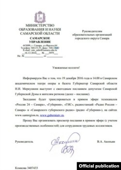 Начальник Самарского управления министерства образования и науки Самарской области Виктор Акопьян 16 декабря разослал на официальном бланке ведомства руководителям местных образовательных учреждений письмо, в котором потребовал "организовать просмотр послания в прямом эфире (с учетом производственных особенностей) для сотрудников трудовых коллективов". Фото документа предоставил "Idel.Реалии" депутат Самарской Губернской Думы Михаил Матвеев.