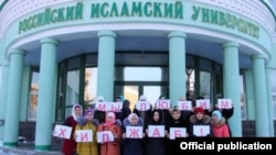 Студенты Российского исламского института в Казани устроили акцию в поддержку женщин-мусульманок из Мордовии. Девушки выстроились на крыльце учебного заведения с листочками, буквы на которых составляют фразу "Мы любим хиджаб!".