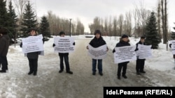 Протестующие держали в руках плакаты "Президент Минниханов. Требуем: "На канале "Татарстан-24" 70% новостей должны быть на татарском", "Трансляция передач телеканала "Татарстан-24" только на русском языке – это издевательство над татарским народом" (перевод с татарского языка – "Idel.Реалии").