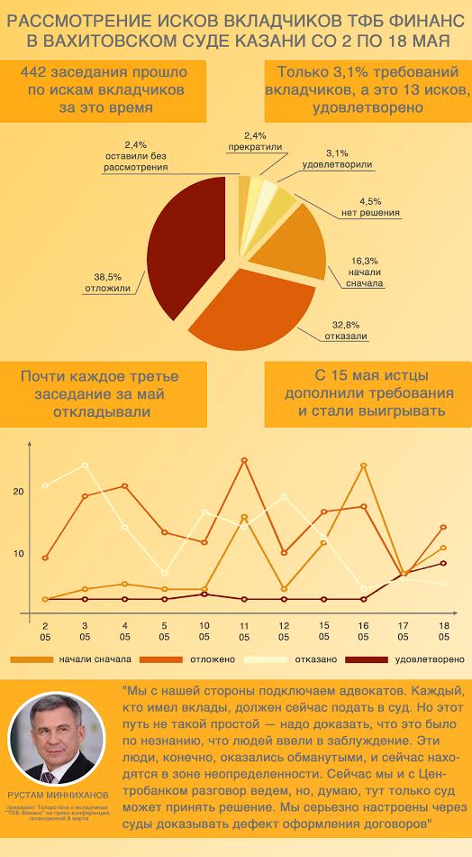 2-18 мая прошло по искам вкладчиков "ТФБ Финанс" прошло 442 заседания. Из них только 13 были удовлетворены. В инфографике "Idel.Реалии" – потерянные деньги в цифрах.