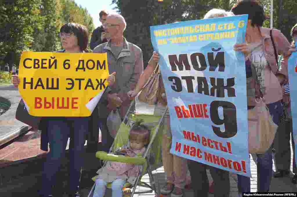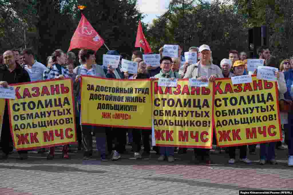 "Казань — столица обманутых дольщиков!", "Мы хотим в свой дом!", "Президент РТ, спасибо вам за мое бездомное детство", "Ждем возобновления строительства", "Наши дети тоже хотят жить в своих квартирах" — с такими плакатами вышли митингующие. Смотрите другие наши фотогалереи здесь.