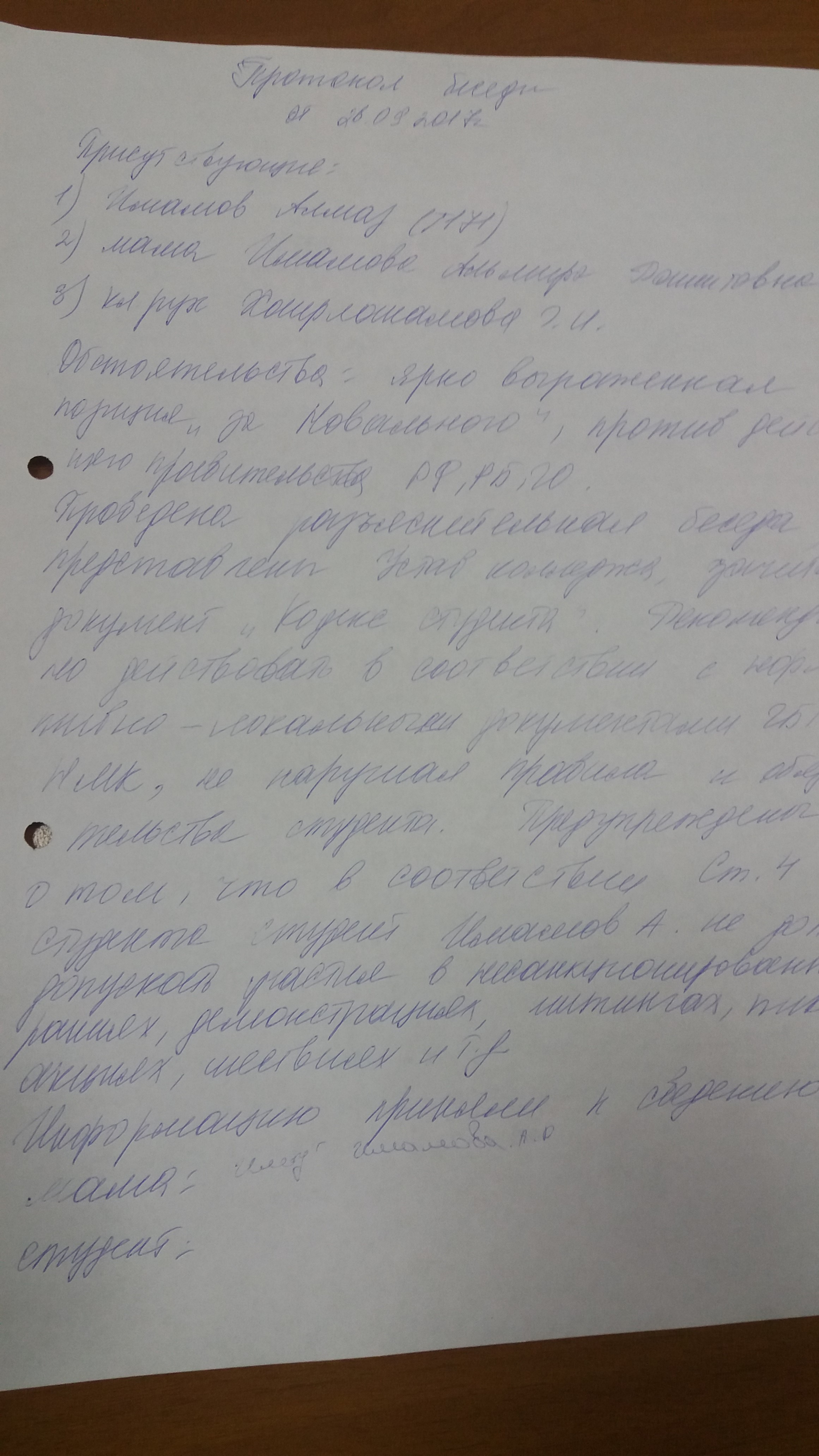 — Суть заключается в следующем — у вашего сына ярко выраженная пропаганда, вообще, позиция против действующего правительства Российской Федерации, Республики Башкортостан, администрации города. Нас это немножечко пугает. С чем связано наше беспокойство? Потому что в преддверии выборов образуются различные митинги, акции и так далее. И если эту позицию ваш сын будет поддерживать, есть вероятность, что он пойдет на такие мероприятия… Если он пойдет на такие мероприятия и, — вот вы смотрите телевизор, новости? — беспорядки происходят, они происходят спонтанно, они не подготовлены. Если какой-то беспорядок произойдет, кто-то что-то кому-то скажет, пойдет какая-то волна беспорядков, и ваш сын в этом момент будет находиться, получается, в этой среде, среди беспорядков — его могут сотрудники внутренних органов задержать. Задержание сотрудниками внутренних органов будет ему не в пользу. Во-первых, это отдел по делам несовершеннолетних — они разбираются кто он и откуда он, кто родители, приглашают родителей на заседание комитета по делам несовершеннолетних в администрацию города...