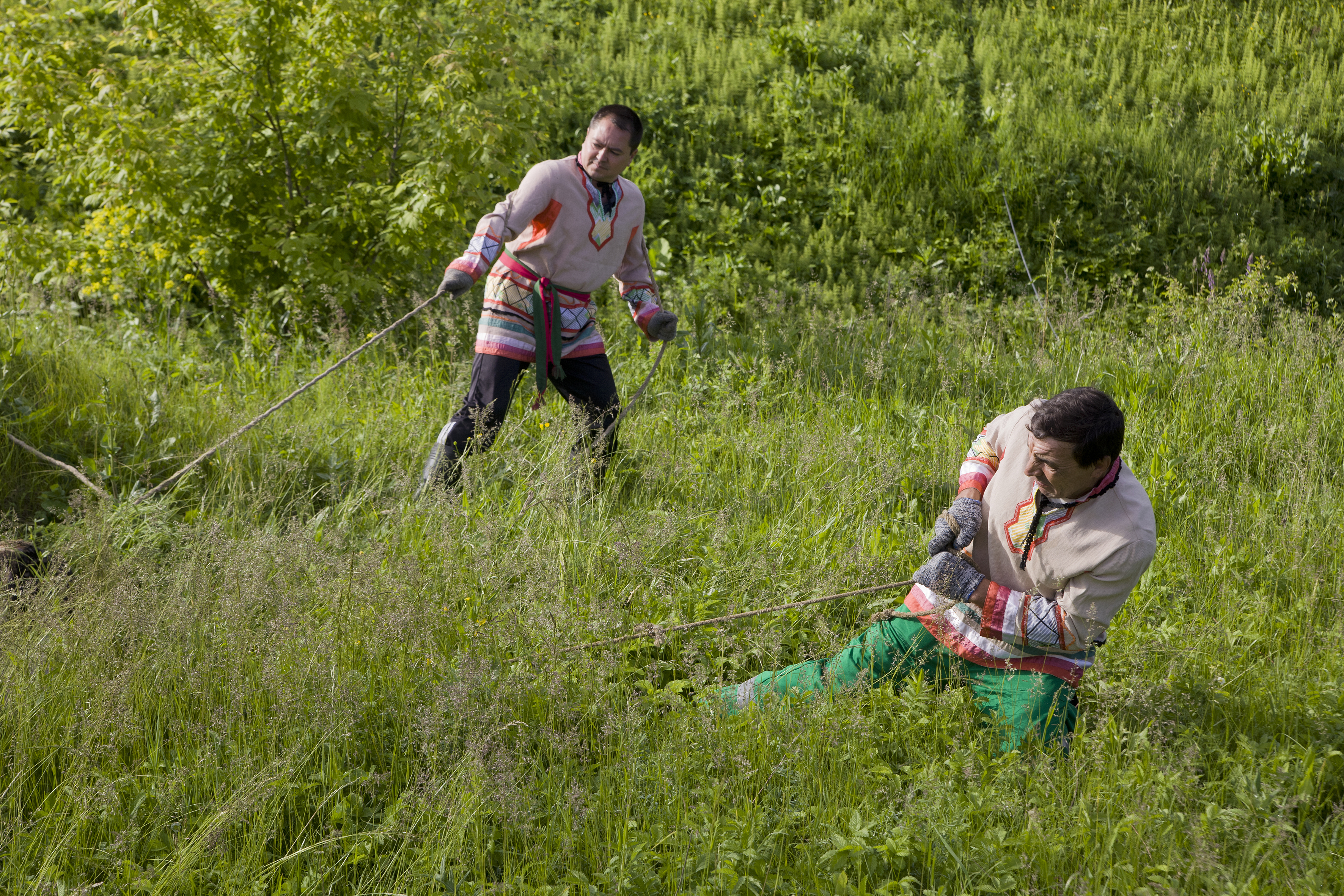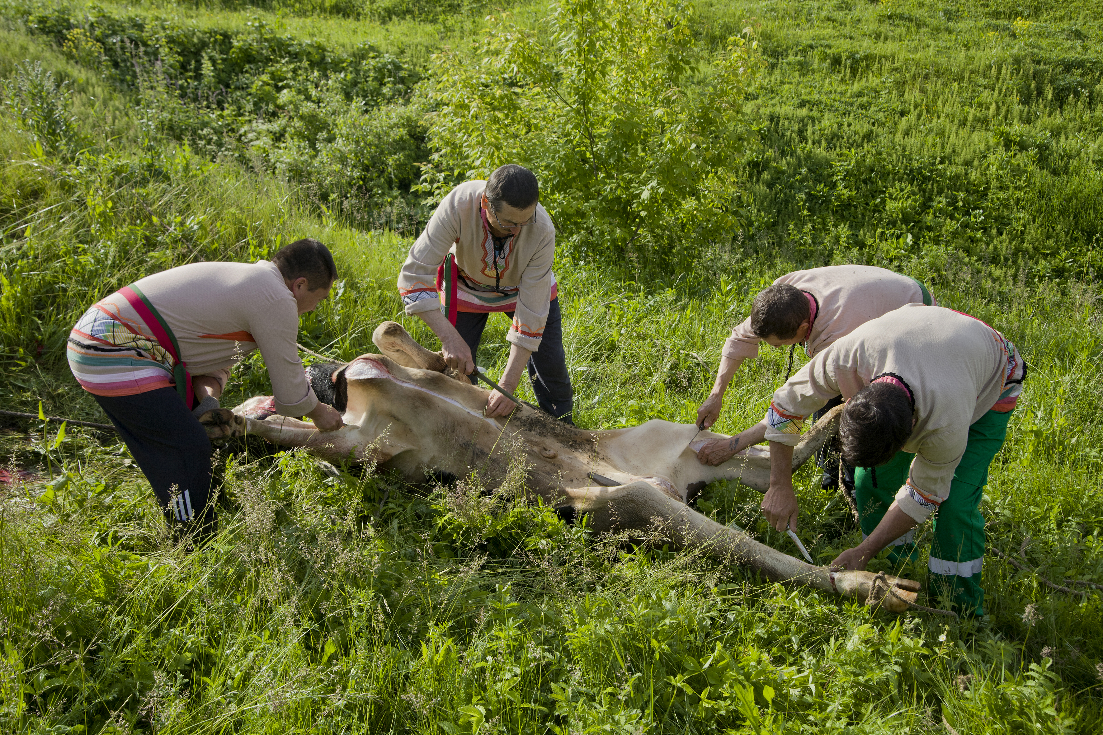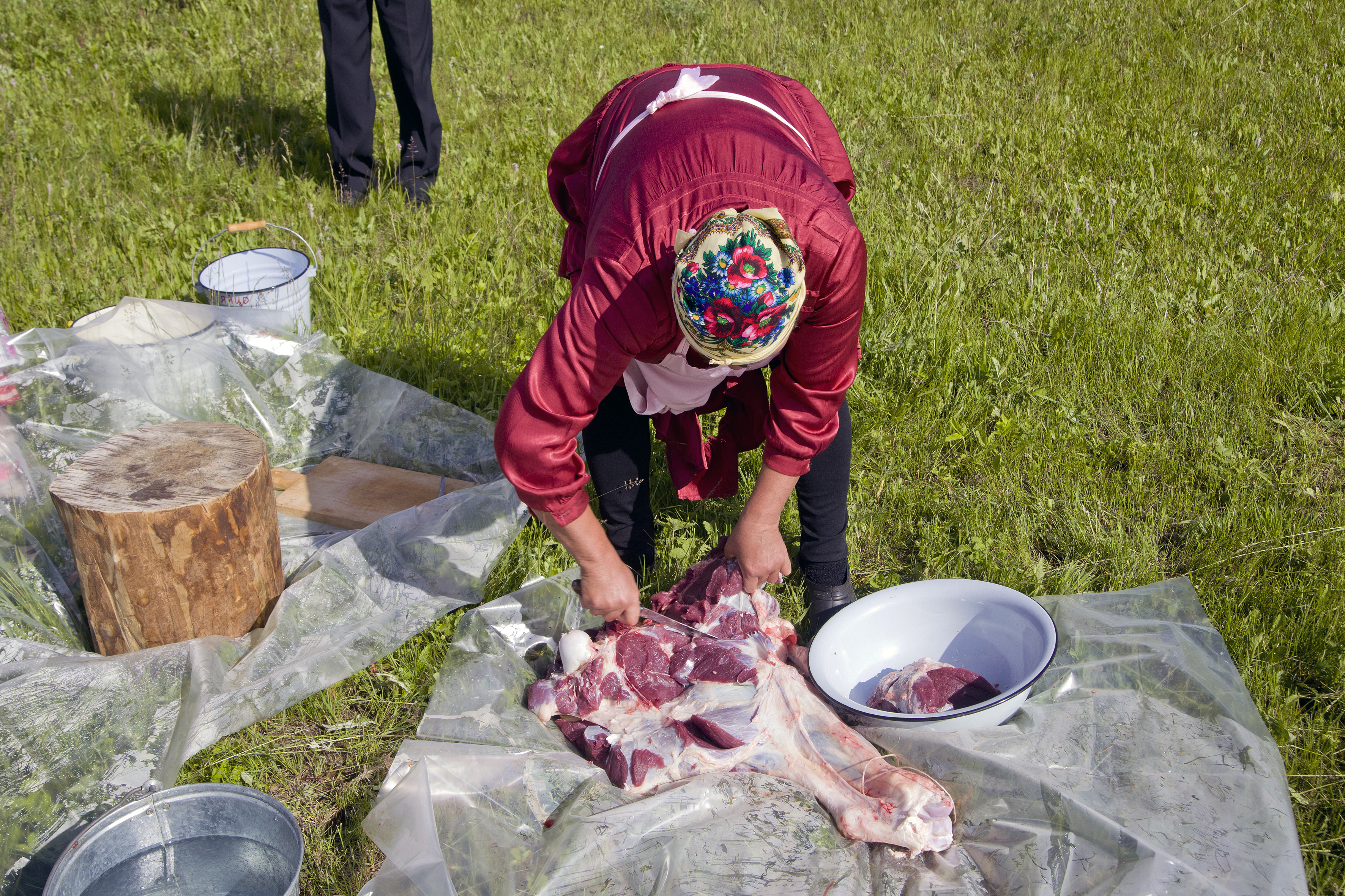 Трое мужчин остаются на поляне и разделывают тушу. Чувашские религиозные предписания запрещают показывать ритуал заклания животных детям, молодым женщинам и девушкам (резали животных в особых, закрытых деревьями местах).