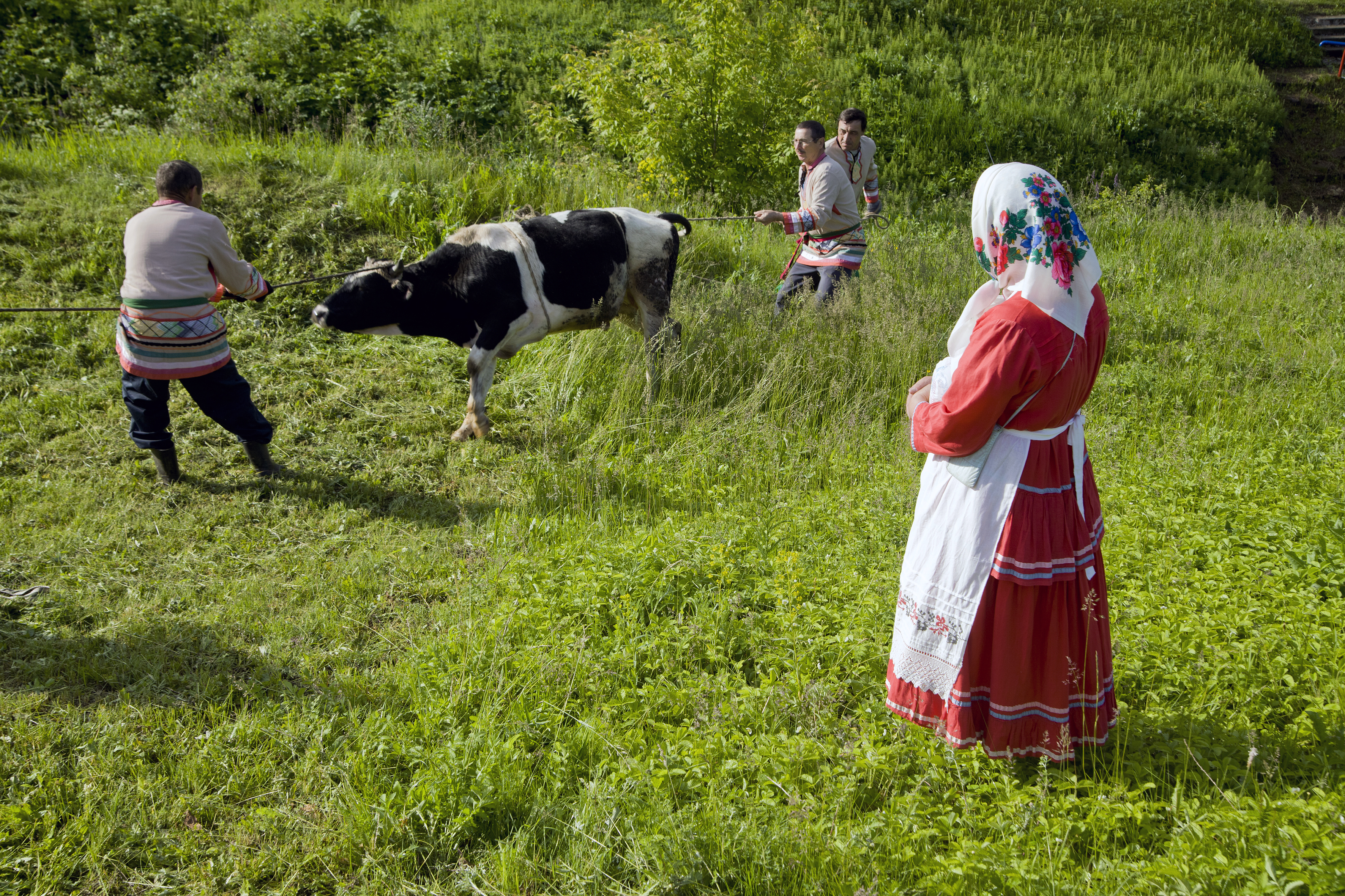 Женщины забирают полотенце и лепешку в нем и уходят к ручью, чтобы отпустить хлеб по течению. Один из мужчин в это время гладит бычка по голове.