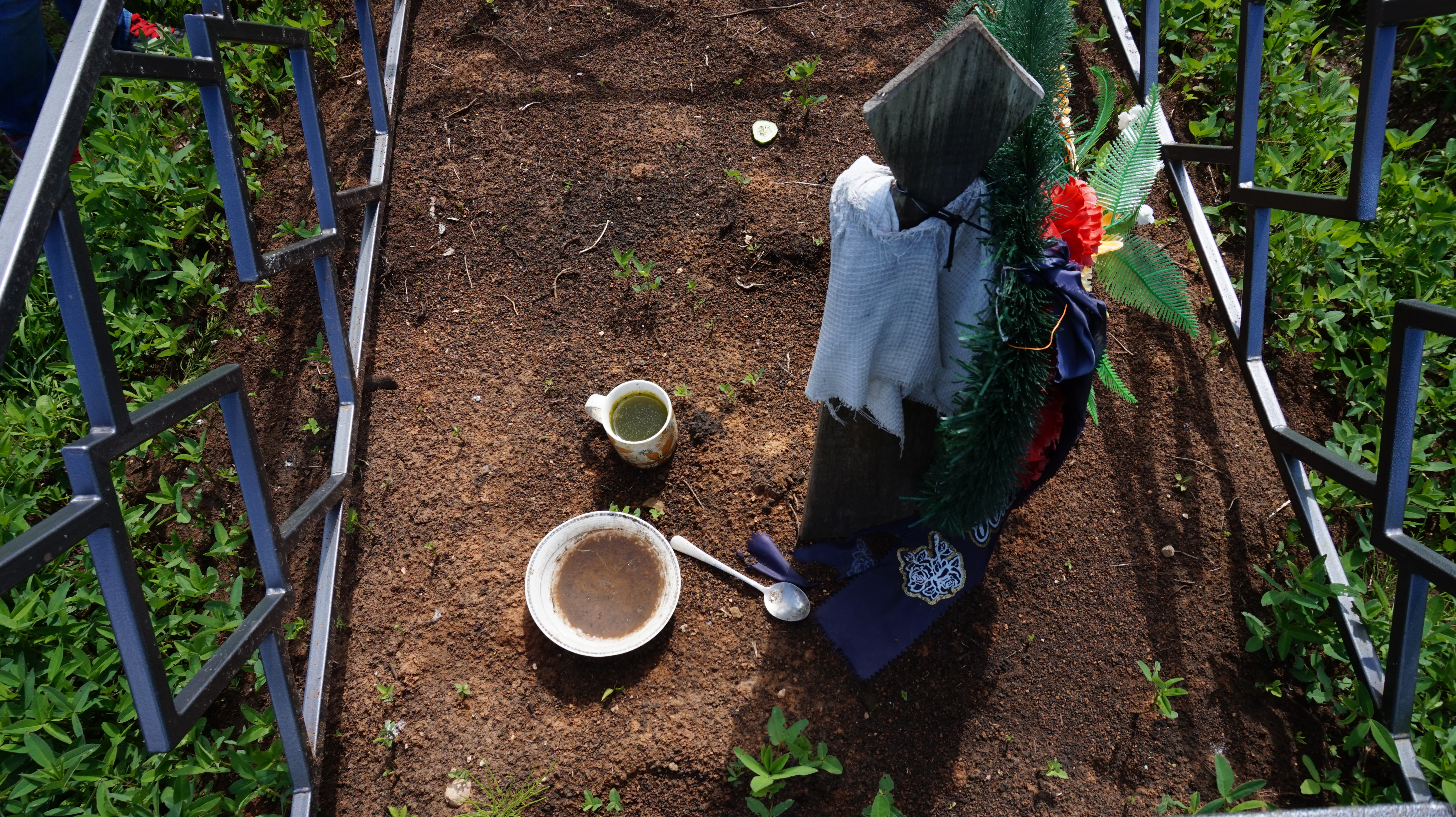 Она забирает у третьей женщины кружку с пивом и, приговаривая молитву, поливает им траву у полотенца.