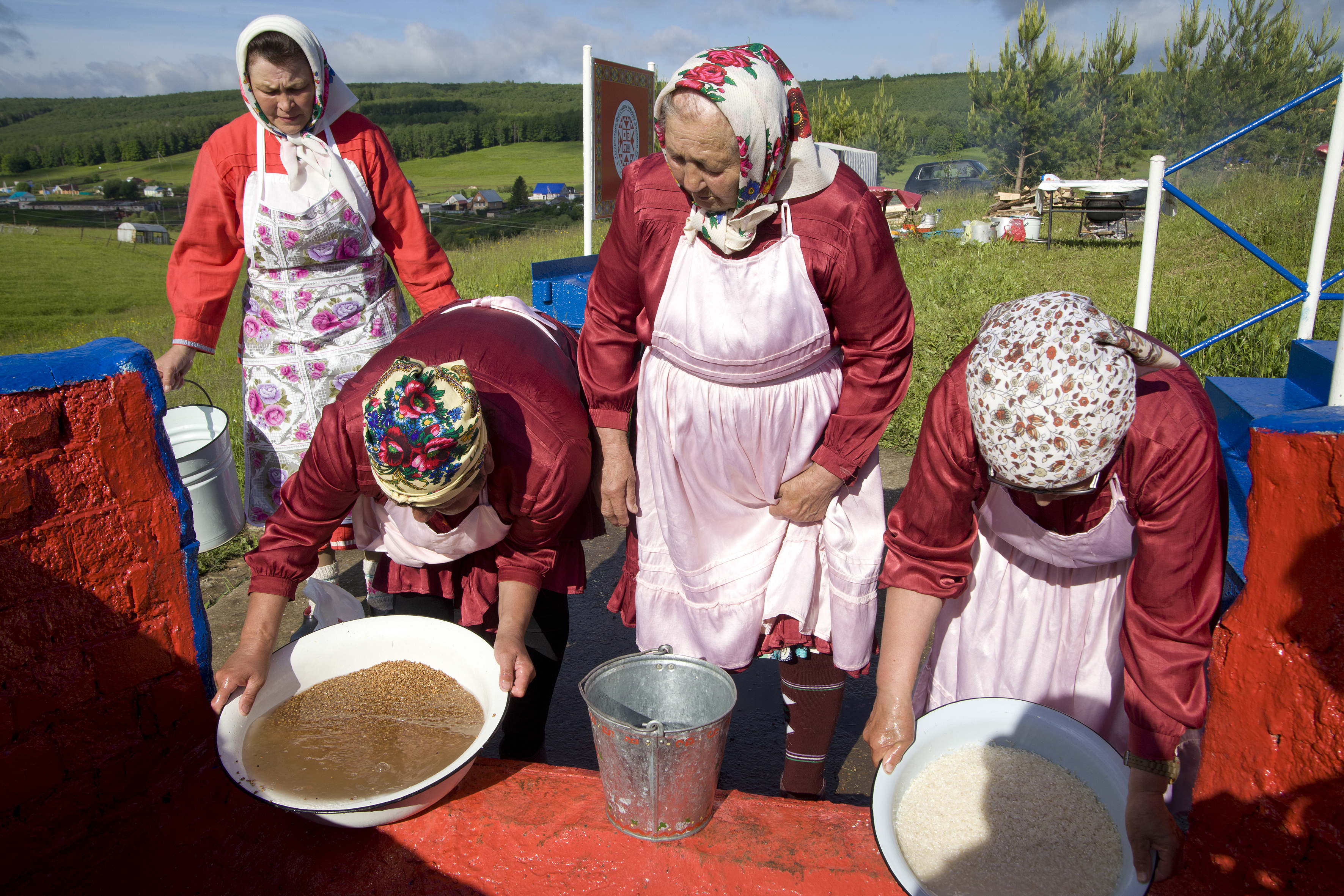 — В советское время скрытно бабушки приходили и делали моление. А с 90-х годов открыто, в виде фестиваля, — рассказывает Галина Бикбова. — К нам [Айрат] Хайруллин (мэр Альметьевска и глава района — ред.) сам приезжает. Мы в Челябинск, Екатеринбург выезжали с этим обрядом, показывали. Там чувашские центры есть. Целый парк был народу, каши не хватило! Специально автобус нам дают. Нас очень поддерживает "Татнефть", "Альметьевнефть". Они вообще у нас очень хорошие друзья, они всегда помогают! Но есть те, кто палки в колеса вставляют, обычно православные. Но их не так много.