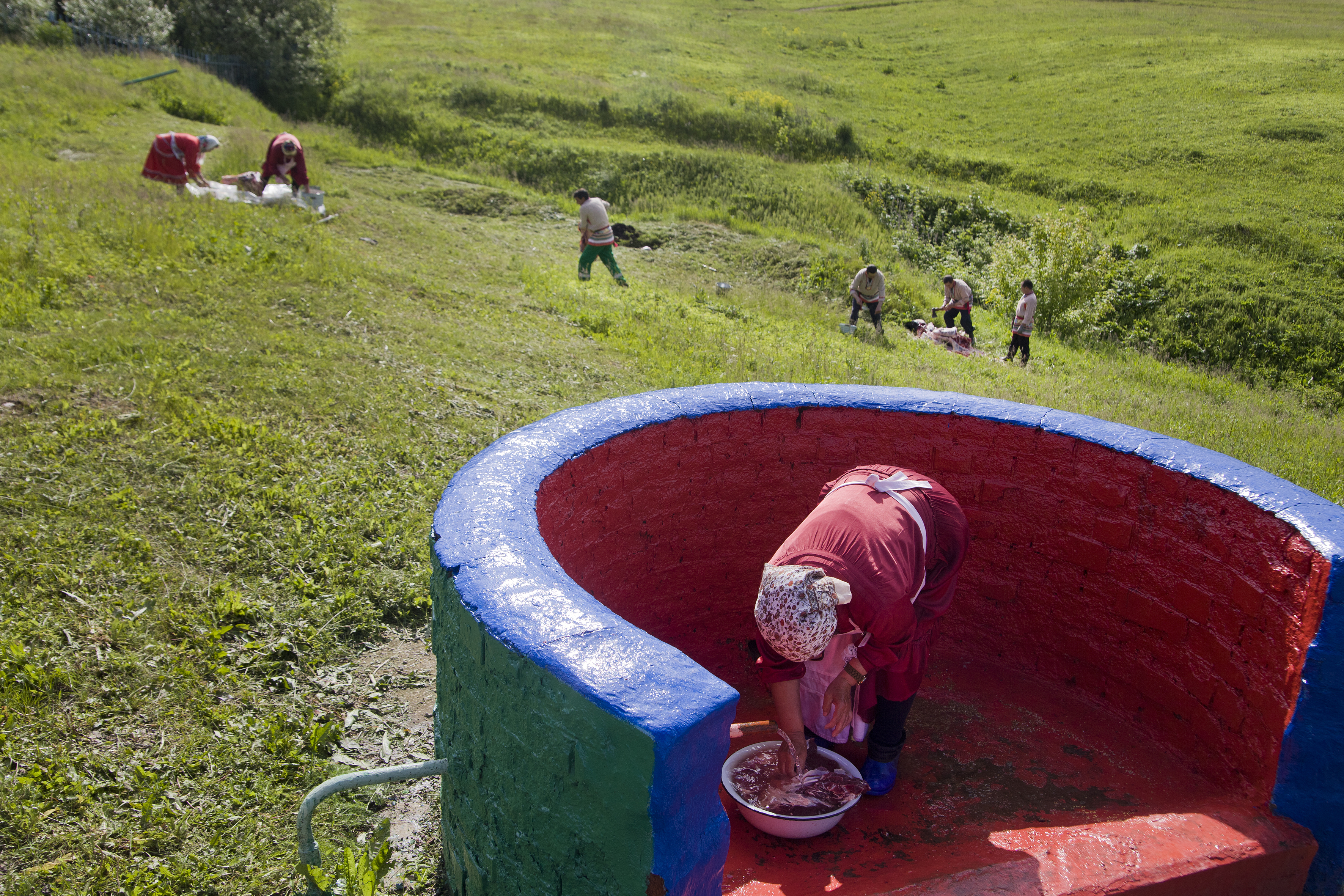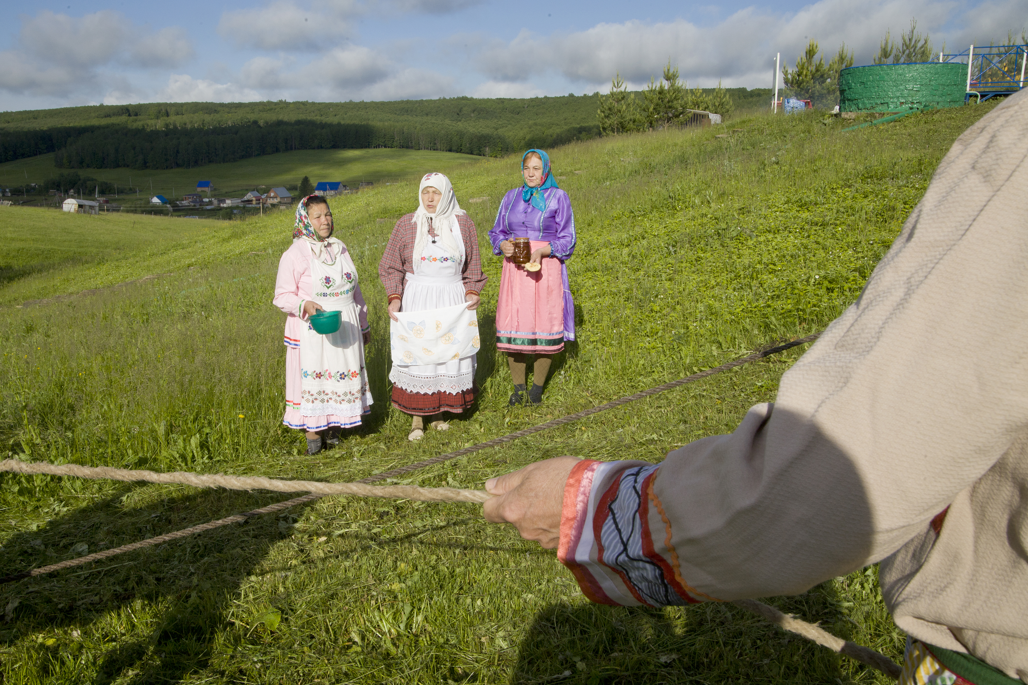 Рано утром на одном из зеленых холмов у села, где из-под земли бьет священный для местных чувашей родник, собралось с два десятка человек в национальной одежде. Их видно издалека — почти все они в красном или розовом одеянии, а с высокого холма уходят ввысь столпы дыма от десяти костров. На каждом из них котлы, в них — закипает вода.