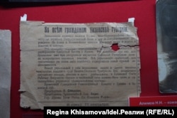— На этой стене закреплена роскошная карта под названием "Триумфальное шествие Советской власти. Октябрь 1917 — март 1918 года". А в витрине под ней показан эпизод татарского национального строительства этих же месяцев — попытка провозглашения штата Идель-Урал. Провозглашение не состоялось из-за противодействия казанских большевиков, что зафиксировано в воззвании никогда не существовавшей Казанской республики. Удалившиеся в Татарскую слободу деятели так называемой "Забулачной республики" заседали в доме Юнусова, фото которого здесь же. Разгонял "Забулачку", в том числе, экипаж броневика, запечатленного на еще одной фотографии. Фото в музей сдал лично шофер бронеавтомобиля Василий Федорович Балаев, и кроме этой фотографии, он подарил и отражатель от броневика. На открытие выставки приходил внук Балаева, он очень гордился дедом.