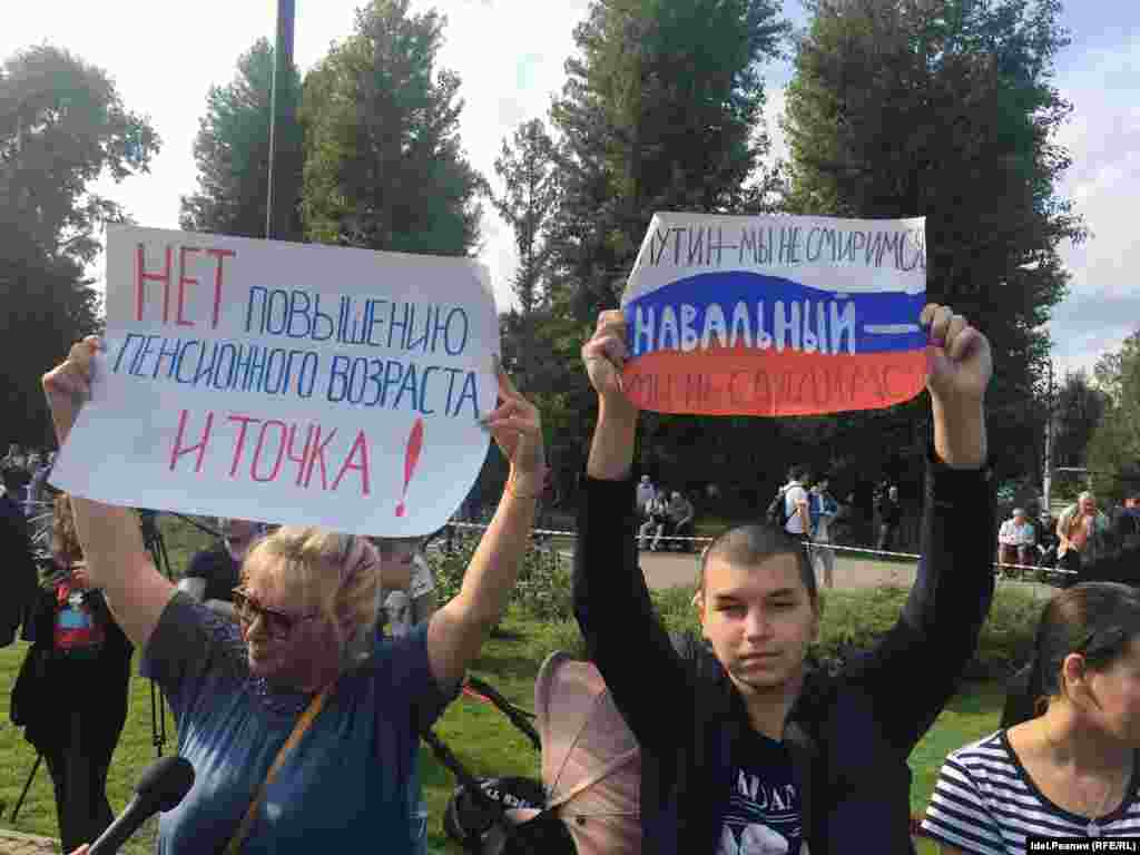 Акция прошла в парке Тинчурина. Исполком города не согласовал митинг, предложив организаторам провести его в посёлке Юдино. Сторонники Навального тем не менее призвали активистов прийти в парк Тинчурина. В акции приняли участие около 500 человек. Двое человек, державших плакат "Нет пенсионной афере", были задержаны. Митинг медленно превращается в шествие. Часть протестующих (около 200 человек) приняла решение идти в сторону центра Казани, пока неизвестно, куда именно.