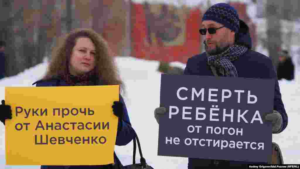 В Казани прошел пикет в поддержку активистки "Открытой России" из Ростова-на-Дону Анастасии Шевченко, в отношении которой возбуждено уголовное дело. Она находится под домашним арестом. Один из плакатов призывал прекратить преследование казанской активистки Гульназ Равиловой. Член совета татарстанского отделения "Открытой России" на днях сообщила о преследовании своего отца.