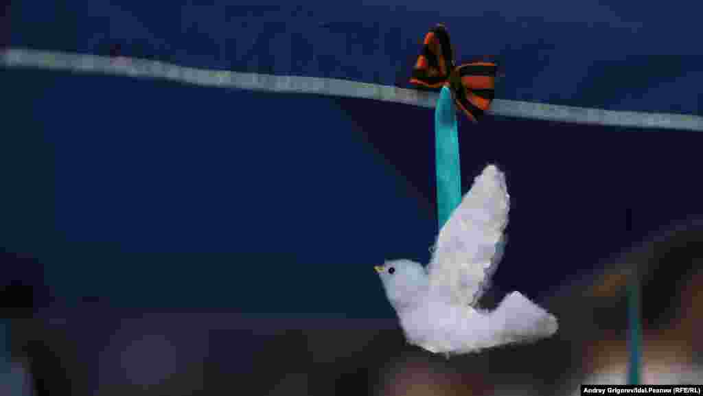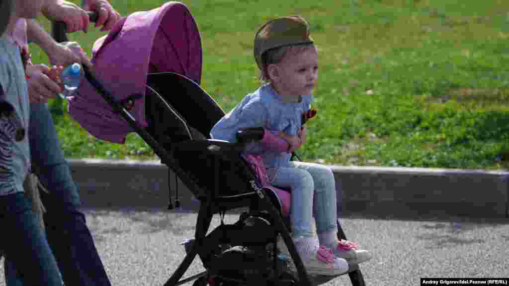 Георгиевские ленты и автомобильные наклейки, которыми уже давно никого не удивишь, оказались потеснены зёлеными пилотками с красными звёздами. Так что теперь георгиевские ленты, вокруг которых поломали столько копий, практически незаметны в пестрой толпе (возможно, потому, что они уже на каждом втором встречном). Тут, правда, тоже заметна некоторая эволюция — некоторые ленты украшены значками и цветочными бутонами — но куда больше бросаются в глаза именно красноармейские пилотки. Торговцы ими расположились у входа в казанский парк Победы. Недорого, 200 рублей — штука. Правда, на взрослые головы головных уборов у продавцов немного. Не то большие размеры уже расхватали, не то основная целевая аудитория — дети.