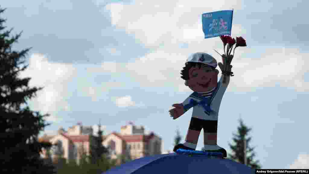 Пилотки соседствуют с красными флажками с надписями "9 мая", над флажками — грозди воздушных шариков с мультяшными персонажами. Преобладают американские герои. Микки Маус, Винни-Пух (явно не из российской анимационной версии); сбоку, правда, нашлось место и для Маши с медведем.