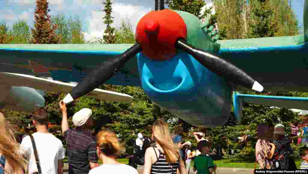 Есть в парке Победы, правда, давно опробованные магниты, которые и в этот раз перетянули на себя большинство посетителей: многочисленная военная техника. Дети — в пилотках и без — оседлали танки, пушки, самолеты. Родители снимают их на смартфоны или, напротив, с негодованием требуют, чтобы не забирались слишком высоко. Из дула ближайшего к выходу парка торчит букетик увядших тюльпанов. Праздник удался.