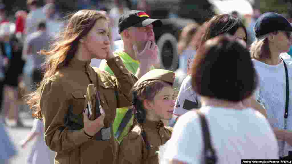 Георгиевские ленты и автомобильные наклейки, которыми уже давно никого не удивишь, оказались потеснены зёлеными пилотками с красными звёздами. Так что теперь георгиевские ленты, вокруг которых поломали столько копий, практически незаметны в пестрой толпе (возможно, потому, что они уже на каждом втором встречном). Тут, правда, тоже заметна некоторая эволюция — некоторые ленты украшены значками и цветочными бутонами — но куда больше бросаются в глаза именно красноармейские пилотки. Торговцы ими расположились у входа в казанский парк Победы. Недорого, 200 рублей — штука. Правда, на взрослые головы головных уборов у продавцов немного. Не то большие размеры уже расхватали, не то основная целевая аудитория — дети.