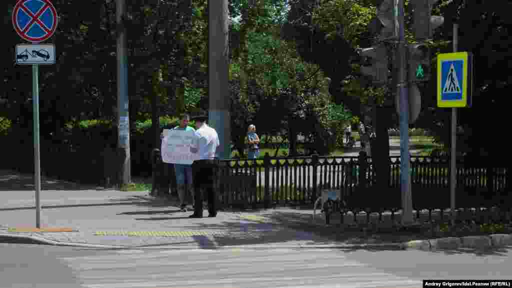 Пикетчики расположились через перекрёсток наискосок от МВД. Прохожих было немного. Вскоре к членам ассоциации подтянулись участники завершившегося пикета на Баумана. Участники протеста по очереди выходили со своими плакатиками к перекрестку. Остальные в это время стояли в тени или прогуливались по Ленинскому саду. Главными же зрителями оказались сотрудники МВД по РТ. Рядом с местом пикета припарковались две полицейские машины. Люди в форме и сотрудник центра "Э" в штатском собирали личные данные участников.