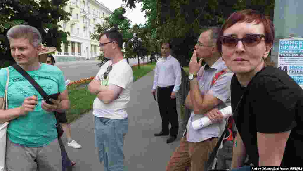 Пикетчики расположились через перекрёсток наискосок от МВД. Прохожих было немного. Вскоре к членам ассоциации подтянулись участники завершившегося пикета на Баумана. Участники протеста по очереди выходили со своими плакатиками к перекрестку. Остальные в это время стояли в тени или прогуливались по Ленинскому саду. Главными же зрителями оказались сотрудники МВД по РТ. Рядом с местом пикета припарковались две полицейские машины. Люди в форме и сотрудник центра "Э" в штатском собирали личные данные участников.