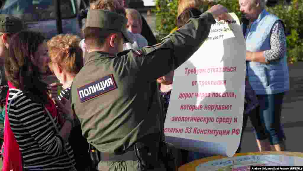 В любом случае власть готовилась к митингу не менее серьёзно, чем протестующие: на подъездах к скверу у ДК Саид-Галеева притаилось несколько автозаков, а саму площадку обнесли ограждением, выставив на двух входах сотрудников батальона "Рысь", которые досматривали не только сумки и рюкзаки, но и плакаты, которые вносили с собой митингующие.