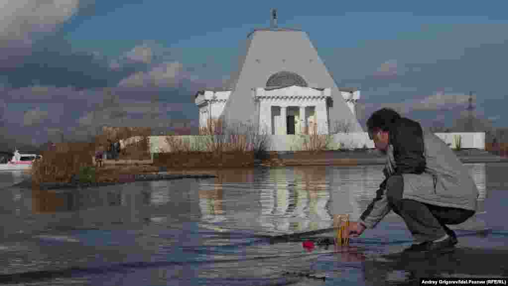 После окончания молитвы небольшая группа верующих во главе с председателем Общества русской культуры РТ Михаилом Щеглов добралась до храма-памятника, на катере, предоставленном МЧС.