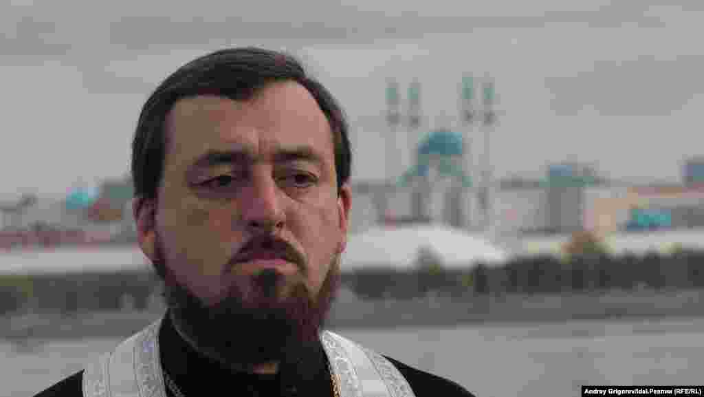 После окончания молитвы небольшая группа верующих во главе с председателем Общества русской культуры РТ Михаилом Щеглов добралась до храма-памятника, на катере, предоставленном МЧС.