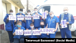 Как сообщили корреспонденту "Idel.Реалии" работники скорой медицинской помощи города Балаково Саратовской области, они также работают в самодельных и строительных масках с отсутствием перчаток. Сегодня в соцсети ВКонтакте в группе "Типичный Балаково" опубликовано фото бригады работников скорой медицинской помощи.