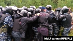 защитников шихана Куштау с сотрудниками частных охранных предприятий, присланных на "флешмоб", организованный в защиту разработки горы для "Башкирской содовой компании".