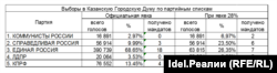 Результаты выборов в Казанскую городскую Думу после очистки от вброса являются еще более впечатляющими. Проекция реалистичной явки 28% на итоги голосования по партийным спискам с коррекцией результата партии власти меняют расклад в Казгордуме драматичным образом. Так, процент "Единой России" опускается с 68,65 до 26,35, а число проведенных партией депутатов с 18 до 7. При этом первое место по партийным спискам с небольшим перевесом занимает КПРФ с 31,6%, а "Справедливая Россия" получает результат, сходный с ЕР (23,5% против 26,35%). При этом проходной барьер в 5% преодолевают ЛДПР и "Коммунисты России", получая в итоге по два депутата по партийным спискам.