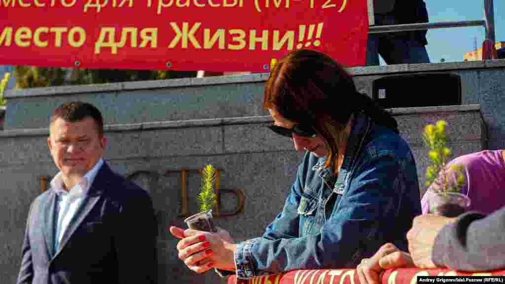 Митинг (его помогла провести ЛДПР) состоялся в сквере Славы на проспекте Победы — в ближайшем к южному выезду из Казани гайд-парке. Собравшиеся — которых, по подсчетам организаторов, было не менее 400 человек — держали в руках горшочки с маленькими сосенками.