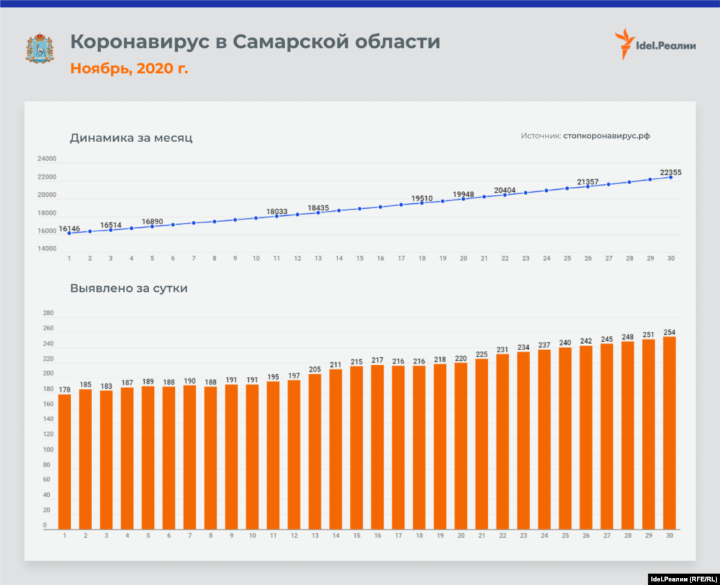 Если в начале месяца в Татарстане ежедневно выявлялось 45 случаев заражения коронавирусной инфекцией, то к концу ноября эта цифра почти удвоилась — до 84-х. В процентном соотношении это наибольший рост среди всех регионов Приволжского федерального округа — наряду с Чувашией и Пермским краем. А вот в Оренбургской и Пензенской областях на протяжении всего месяца цифры практически идентичные: ежедневно выявлялось чуть ли не одинакое количество случаев инфицирования.