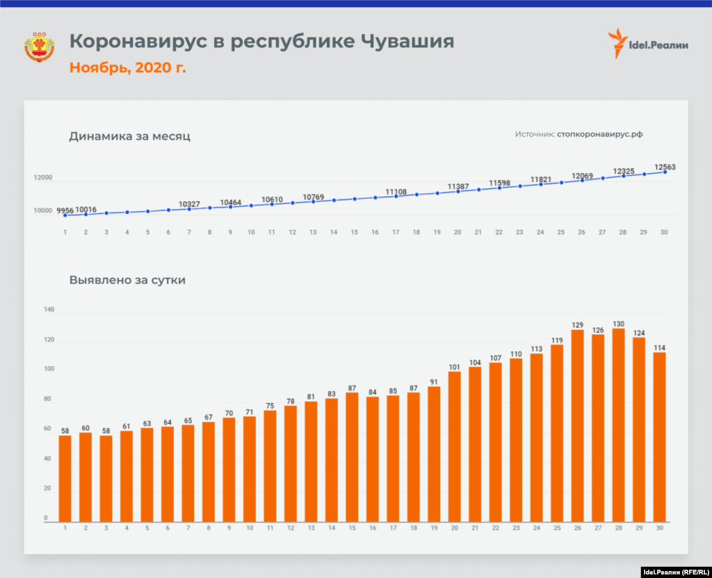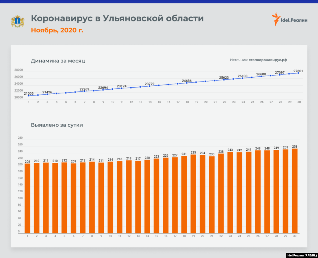 Если в начале месяца в Татарстане ежедневно выявлялось 45 случаев заражения коронавирусной инфекцией, то к концу ноября эта цифра почти удвоилась — до 84-х. В процентном соотношении это наибольший рост среди всех регионов Приволжского федерального округа — наряду с Чувашией и Пермским краем. А вот в Оренбургской и Пензенской областях на протяжении всего месяца цифры практически идентичные: ежедневно выявлялось чуть ли не одинакое количество случаев инфицирования.