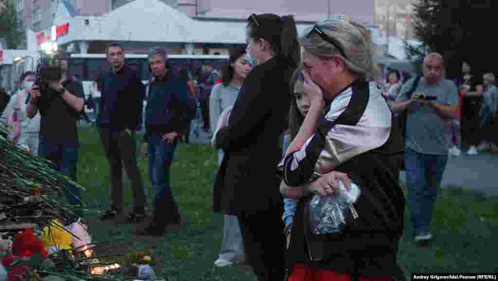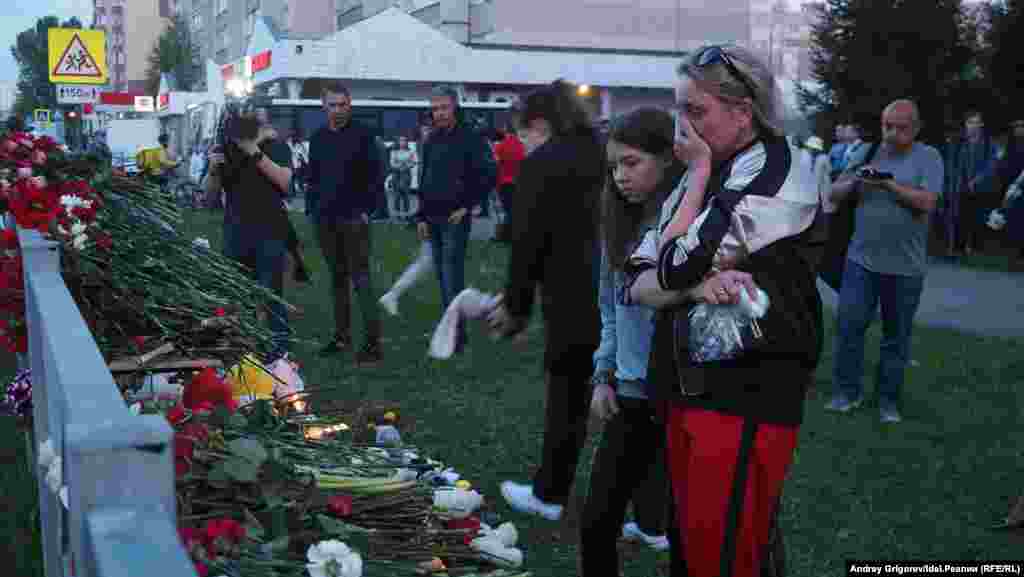 Казанцы до поздней ночи несли цветы, мягкие игрушки и свечи к школе, которая 11 мая подверглась атаке вооруженного ружьём 19-летнего парня. Уже в восемь вечера импровизированный мемориал утопал в цветах и плюшевых мишках. Он был организован на газоне наискосок от школы. К самому учебному заведению многочисленных казанцев не подпускала полиция.