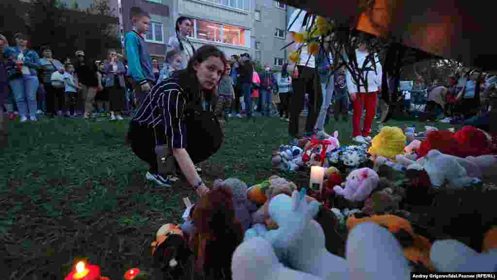 Казанцы до поздней ночи несли цветы, мягкие игрушки и свечи к школе, которая 11 мая подверглась атаке вооруженного ружьём 19-летнего парня. Уже в восемь вечера импровизированный мемориал утопал в цветах и плюшевых мишках. Он был организован на газоне наискосок от школы. К самому учебному заведению многочисленных казанцев не подпускала полиция.