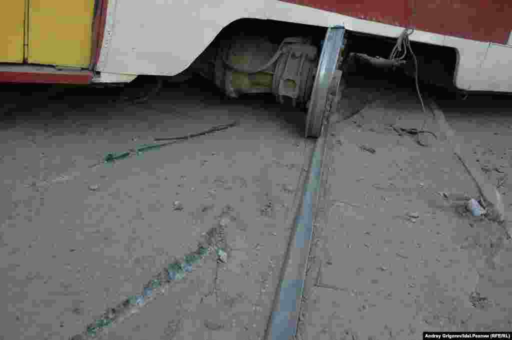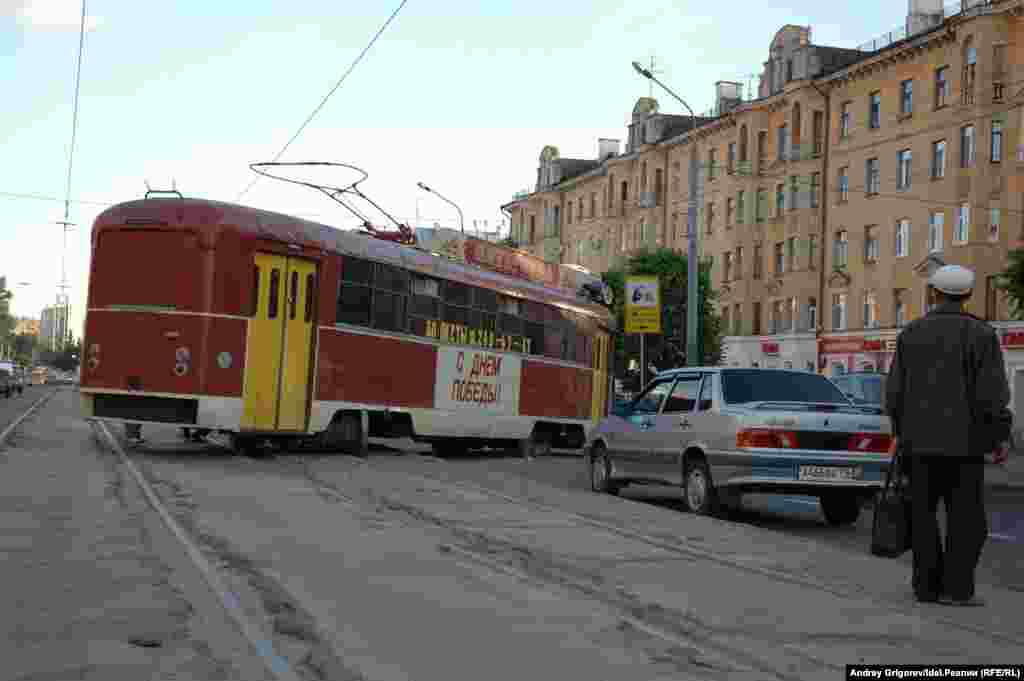 Трамвай-трактир "Пятёрочка" сошёл с рельс и перекрыл проезжую часть на улице Декабристов у остановки Гагарина. Июнь 2007 года.