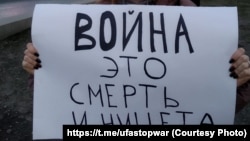 Султангареева проводила одиночный пикет 11 апреля в Уфе. В руках активистка держала плакат со словами: "Война это смерть и нищета".