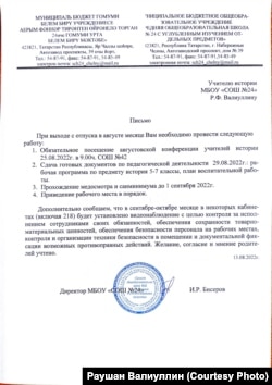 Преподаватель истории в школе №24 в Набережных Челнах, активист Раушан Валиуллин сообщил, что в сентябре и октябре этого года в кабинетах общеобразовательного учреждения, в том числе его, "будет установлено видеонаблюдение с целью контроля за исполнением сотрудниками своих обязанностей". Письмо за подписью директора школы Ильгизара Бисерова Валиуллин опубликовал на своей странице в Facebook.