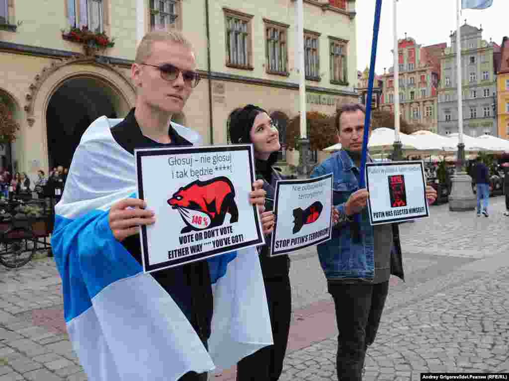С начала нападения РФ на Украину россияне, живущие во Вроцлаве, проводят у городской ратуши театрализованные акции протеста. Очередная, в сентябре, была посвящена минувшим российским выборам. Участники постановки предлагали прохожим проголосовать.