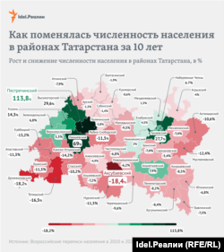 В минусе даже такие районы со сравнительно большими городами как Лениногорск, Бугульма, Чистополь, а также "колыбель" татарского языка: Арский, Балтасинский, Актанышский, Муслюмовский районы.