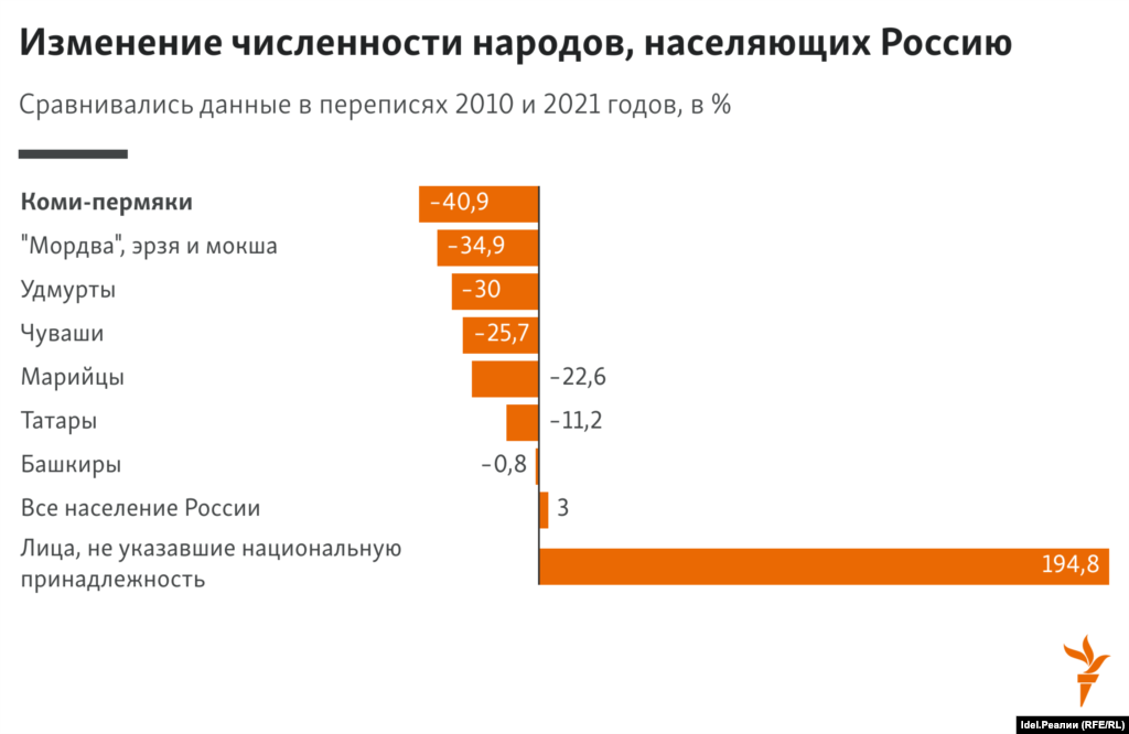 На 35% стало меньше "мордвы" (эрзя и мокши) — 744,2 тысячи человек в 2010-м против 484,5 тысячи в 2021 году); на 30% — удмуртов (552,3 тысячи человек в 2010-м и 386,5 тысячи человек в 2021 году) и более чем на 20% — чувашей (1,4 млн человек в 2010-м против 1 млн человек в 2021 году) и марийцев (547,6 тысячи в 2010-м против 423,8 тысячи человек в 2021 году).