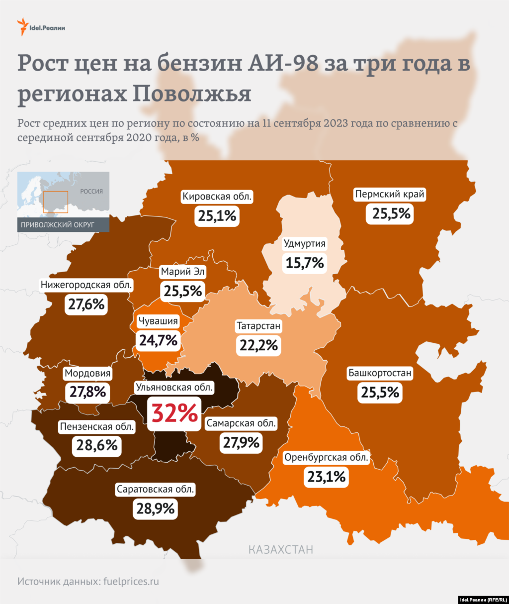 Что касается дизельного топлива, то он подорожал сильнее всего также в Самарской области — сразу на 32,3%. На втором месте по росту Саратовская (31,5%) и Кировская области (30,5%).