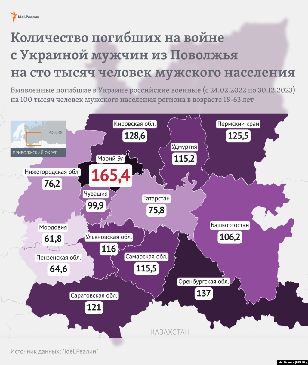 По количеству погибших мужчин на 100 тысяч мужского населения на первом месте оказалась республика Марий Эл с 165,4 погибшими на 100 тыс. Следом идут Оренбургская область — 137 на 100 тысяч, Кировская область — 128,6 на 100 тысяч мужского населения и Пермский край — 125,5.