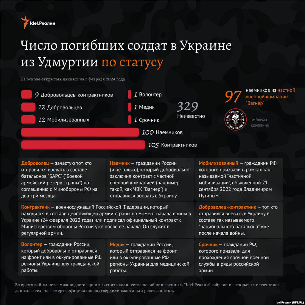 Как минимум 105 человек числились контрактниками — это те, кто находились в составе действующей армии страны на момент начала войны в Украине (24 февраля 2022 года) или подписали официальный контракт с Министерством обороны России уже после ее начала. Они служили в регулярной армии. Еще 100 человек были наемниками; 12 — мобилизованными; 21 — добровольцами разных категорий.