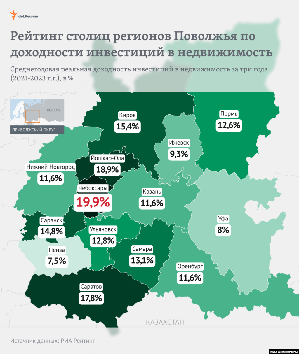 За последние три года самая высокая доходность в Поволжье была в столице Чувашии — Чебоксарах. Среднегодовая доходность с корректировкой на потребительскую инфляцию там составила 19,9%. Такие данные содержатся в рейтинге, составленном РИА Рейтинг.
