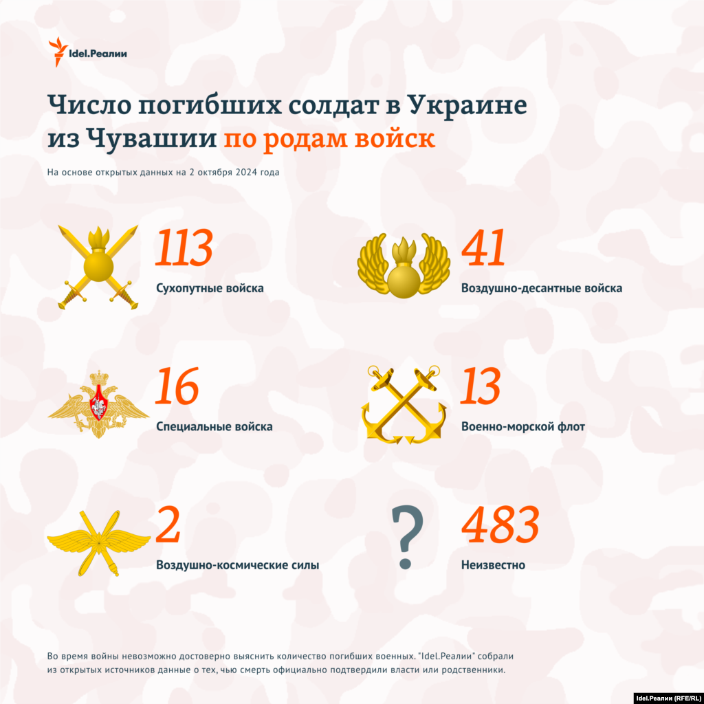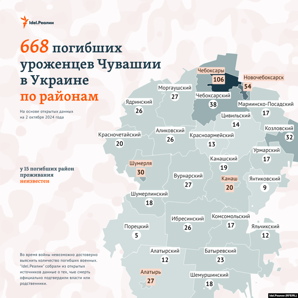 "Idel.Реалии" собрали всю известную на данный момент информацию о погибших на войне уроженцах Чувашии — возраст, звания, районы, образование, дети, медали и др. Всего, по данным на 2 октября 2024 года, погибшими признаны как минимум 668 человек из Чувашии.