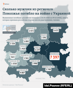 Об этом свидетельствуют расчеты "Idel.Реалии" на 9 октября, основанные на данных из базы погибших уроженцев Поволжья с начала полномасштабного вторжения России в Украину.