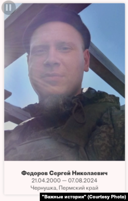 Еще один молодой человек, который оказался в списке погибших в Курской области, — Сергей Федоров из города Чернушки Пермского края. На момент смерти ему было 24 года, он погиб 7 августа 2024-го, а похоронили его лишь в июне 2025 года. Какой-либо другой информации о нем нет.