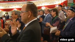 Выступает Рустам Минниханов. Делегаты встретили его стоя.